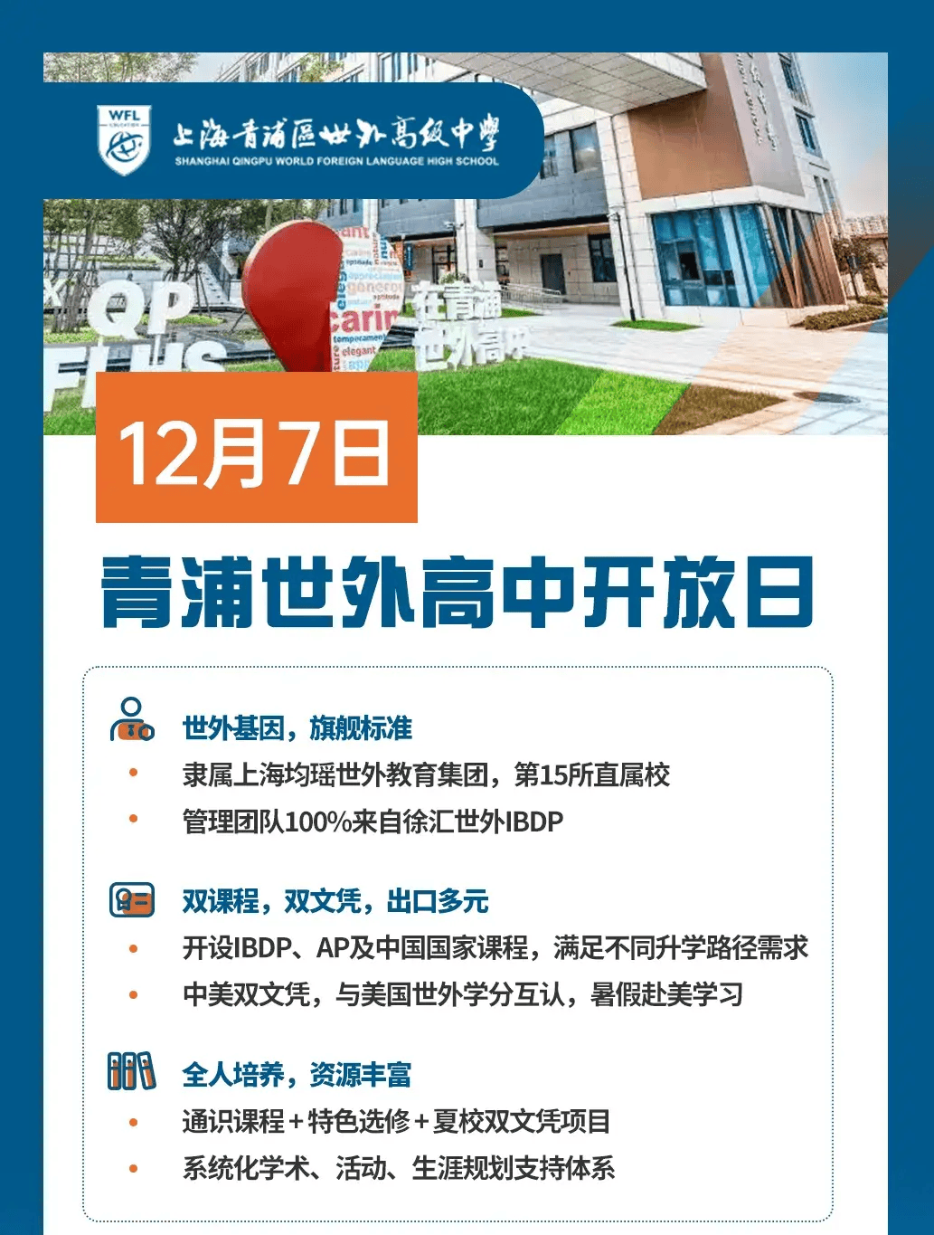 总而言之,取而代之的是立异性的IB&AP深度融合通识教育课程系统!以面向将来的多元能力成长为方针,学生就读期间,使得青浦世外成为一所完整的K12学校,2017年开办上海青浦区世界外国语长儿园;则是从2016年到2024年接棒岑校,努力于建构具有“学术性、时代性、多元性、融合性、实践性”的世外教育特色课程系统。